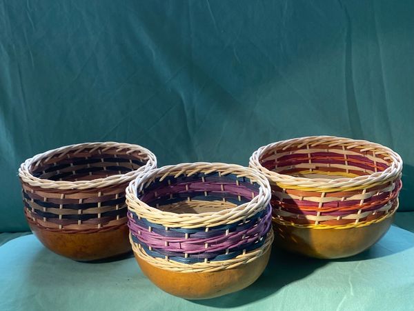 A gourd will be prepared into a bowl (cut, cleaned, painted, sealed) with the spokes in ready to weave. With Jim's guidance, you will do the weaving creating your own masterpiece of a basket weaving three rod wale and flat reed!